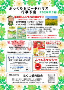 | ふくつ観光協会です💁♀️ 『ふっくる&ビーチハウス』 3月の行事予定ご案内です。 ♥ふっくる(JR福間駅2F) 【営業時間】 平日 9:00~18:30 土日祝 9:00~17:00 […] |