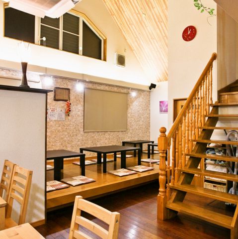 カントリー調のお洒落でカワイイお店。 デートやファミリーでの食事にぴったり!ママ友同士の食事会にもおすすめ♪ 店内は高い吹き抜けのある贅沢な空間。 明るく開放感があって、とても居心地がいい。ゆっくり寛げるお店です。 店の奥には座敷席もあり、グループでも気兼ねなく盛り上がれる。 小さな子供連れでも安心して食事ができる。